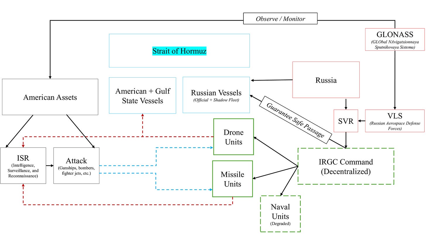 The IRGC alone does not possess satellite capabilities sufficient to carry out this strike.9 Iran’s Tolou-3 satellite series can only conduct low Earth orbit (LEO) operations10, and can only photograph real-time imagery at an accuracy of thirty to sixty feet (five to ten meters)11, meaning Russian capabilities were likely used to identify and target American aircraft.12 The Russian Aerospace Defense Forces’ (VKS) GLObal NAvigatsionnaya Sputnikovaya Sistema (GLONASS) satellite constellation is likely responsible for identifying the E-3 Sentry13, while the SVR is likely responsible for delivering the coordinates to the IRGC. Russia is likely sharing this intelligence in order to 1) degrade American capabilities in the region and 2) perpetuate the effective closure of the Strait of Hormuz to Western allies while 3) guaranteeing safe passage for Russian vessels. This relationship is diagrammed below.
